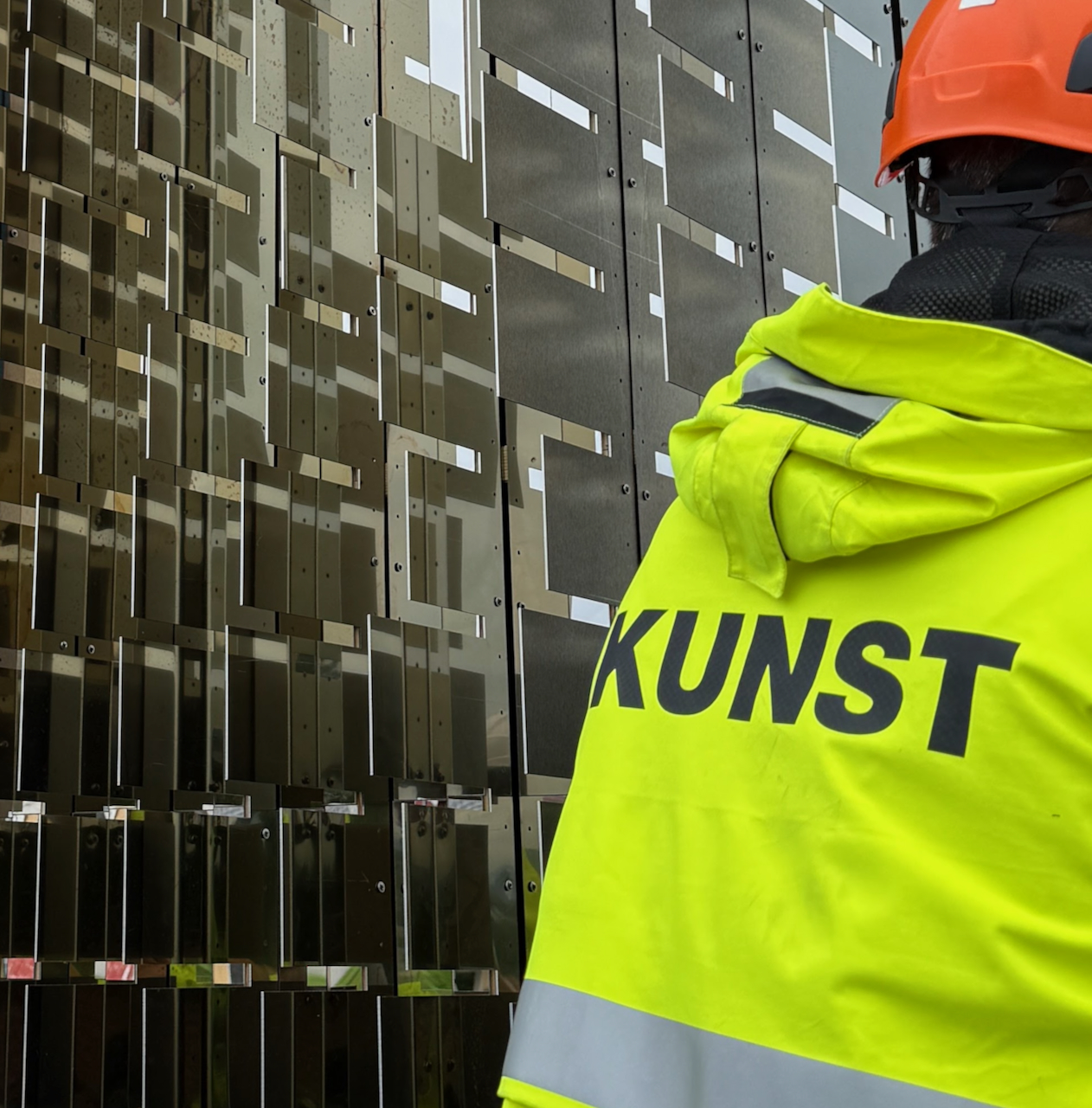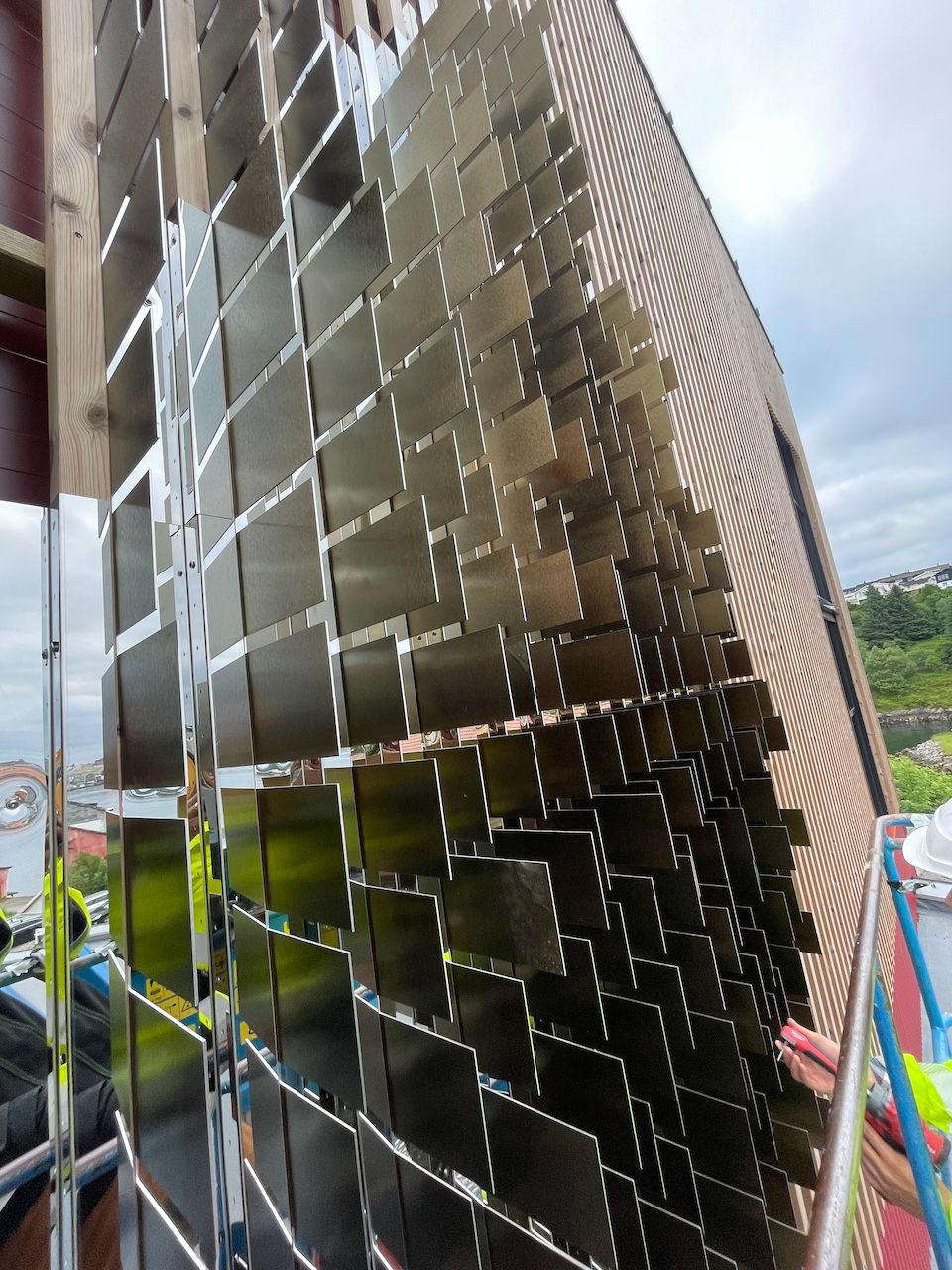 Verket lyses opp av en diskrét lyskaster i mørket, mens sol og skyer og himmel speiles i stålet på dagtid og gir uttrykket uendelig, naturlig variasjon.